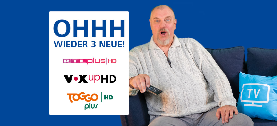 Im Basis-HD-Paket der RFT kabel steckt jetzt noch mehr für Sie drin: Wir erhöhen die Sendervielfalt um drei zusätzliche TV-Sender - RTL Plus HD, VOXup HD & TOGGO Plus HD. Ein Plus an HD-Unterhaltung, für Kinder und Erwachsene! Lesen Sie mehr über die neuen Sender und erfahren Sie auch, was Sie für den Empfang beachten müssen.