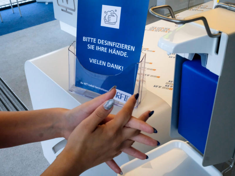 Um unsere Mitarbeiter und Kunden weiterhin vor der Virusgefahr zu schützen, erinnern vor den RFT-Kundencentern Aufsteller an die nun geltenden Hygienemaßnahmen. Aufgrund der anhaltenden Kontaktbeschränkungen sind wir weiterhin angehalten die Personenzahl in den Kundencentern niedrig zu halten und die Wartebereiche der neuen Situation anzupassen. In den Eingangsbereichen haben wir Spender mit Desinfektionsmittel aufgestellt, so dass sichergestellt ist, dass Besucher beim Eintritt und/oder Verlassen unserer Kundencenter ihre Hände desinfizieren können.