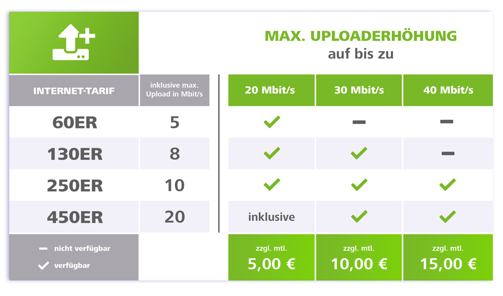 - Upload-Erhöhung auf bis zu 20, 30 oder 40 Mbit/s